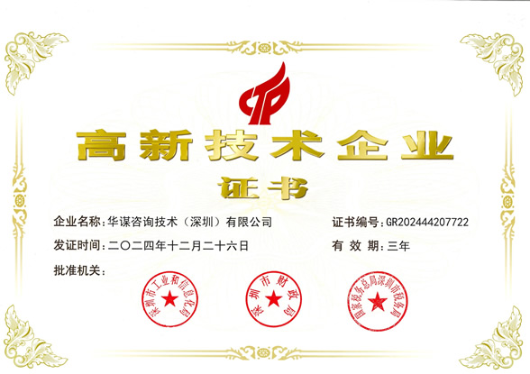根據國家《高新技術企業認定管理辦法》和《高新技術企業認定管理工作指引》的有關規定,華謀咨詢技術(深圳)有限公司憑借團隊專業技術研發能力、持續創新能力和企業管理能力,順利通過由科技部、財政部、稅務總局組織的國家高新技術企業認定,目前,華謀咨詢技術(深圳)有限公司是國內管理咨詢領域內獲得國家高新技術企業認證的企業。